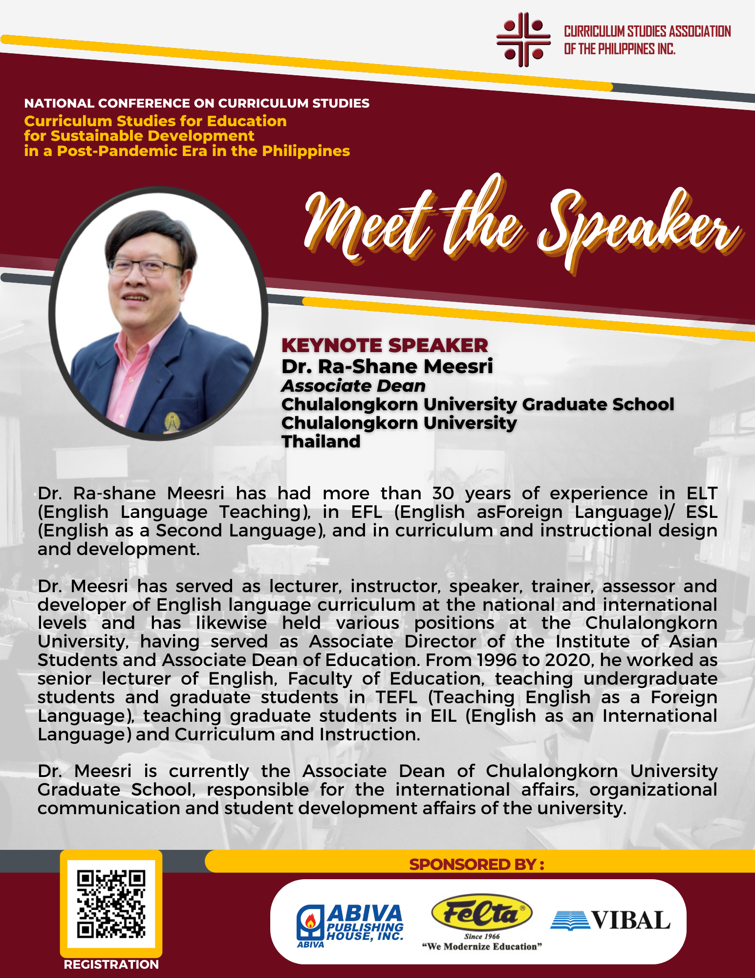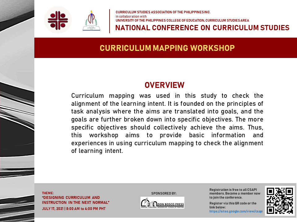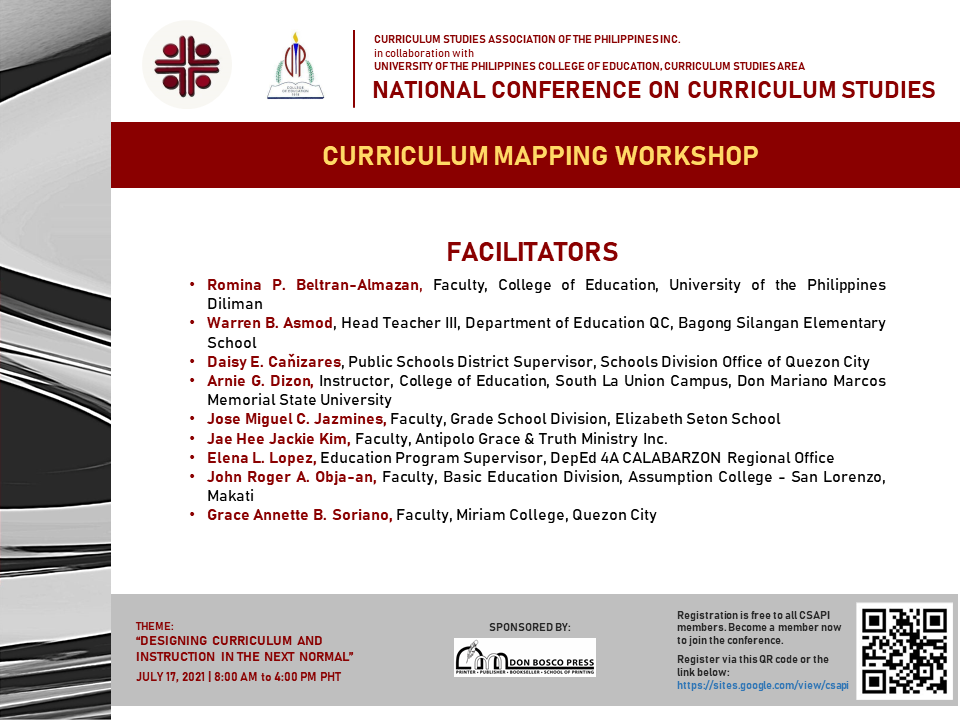 The very first national conference organized by CSAPI was held last July 17, 2021 from 8am to 3pm with the theme : “Designing Curriculum and Instruction in the Next Normal”. This conference was conducted online due to the prevalence of the Covid pandemic but despite the conference not being face to face, the conference nonetheless turned out to be a success with more than 200 participants in attendance to the virtual event. The Keynote Speaker was Dr. Ng Soo Boon, Senior Lecturer from SEGI University, Malaysia, who spoke on the topic : “Charting the Next Normal : Developing Hybrid Learning Curriculum Framework”. Plenary sessions were given by Dr. Diosdado San Antonio (DepEd Undersecretary), Dr. Jessie Barrot (Dean, College of Education, Arts and Sciences, National University) and Dr. Luis Calingo (President, Holy Angel University), all giving their own presentations as to how the theme applied to Basic Education and Higher Education in the Philippines. The afternoon was more hands-on learning as participants underwent a Curriculum Mapping Workshop and the conference concluded with parallel sessions as various research studies were presented during the Paper Presentation portion.