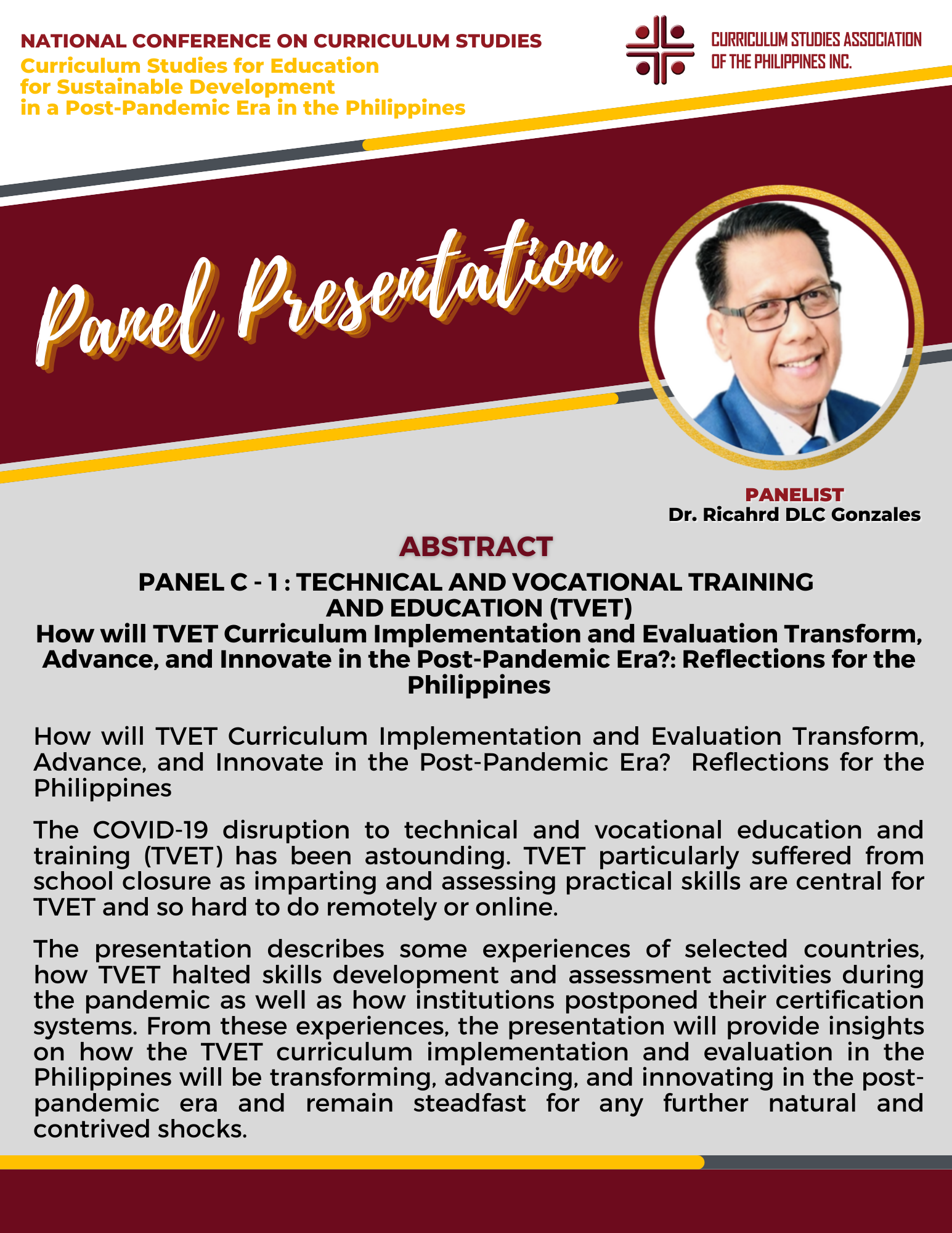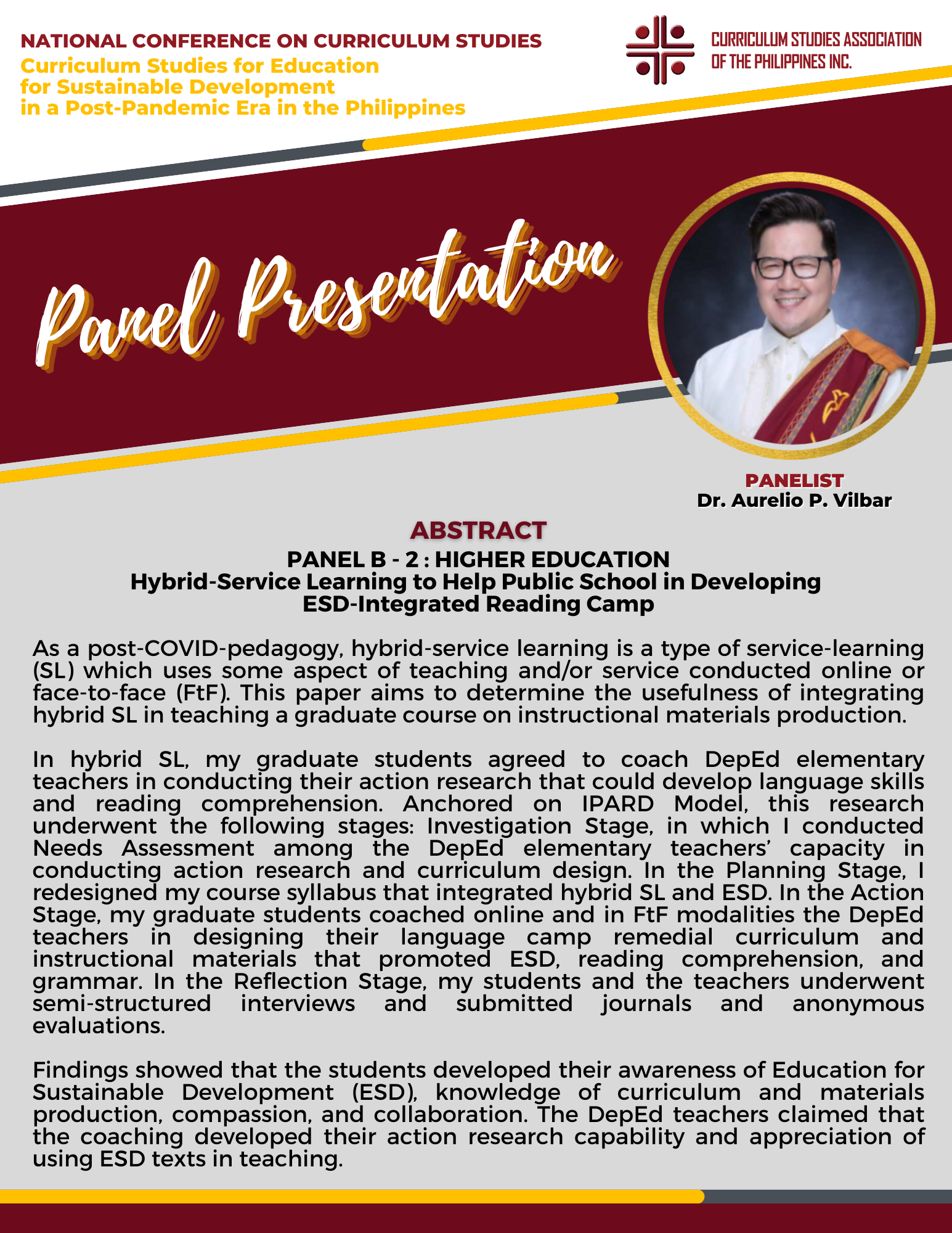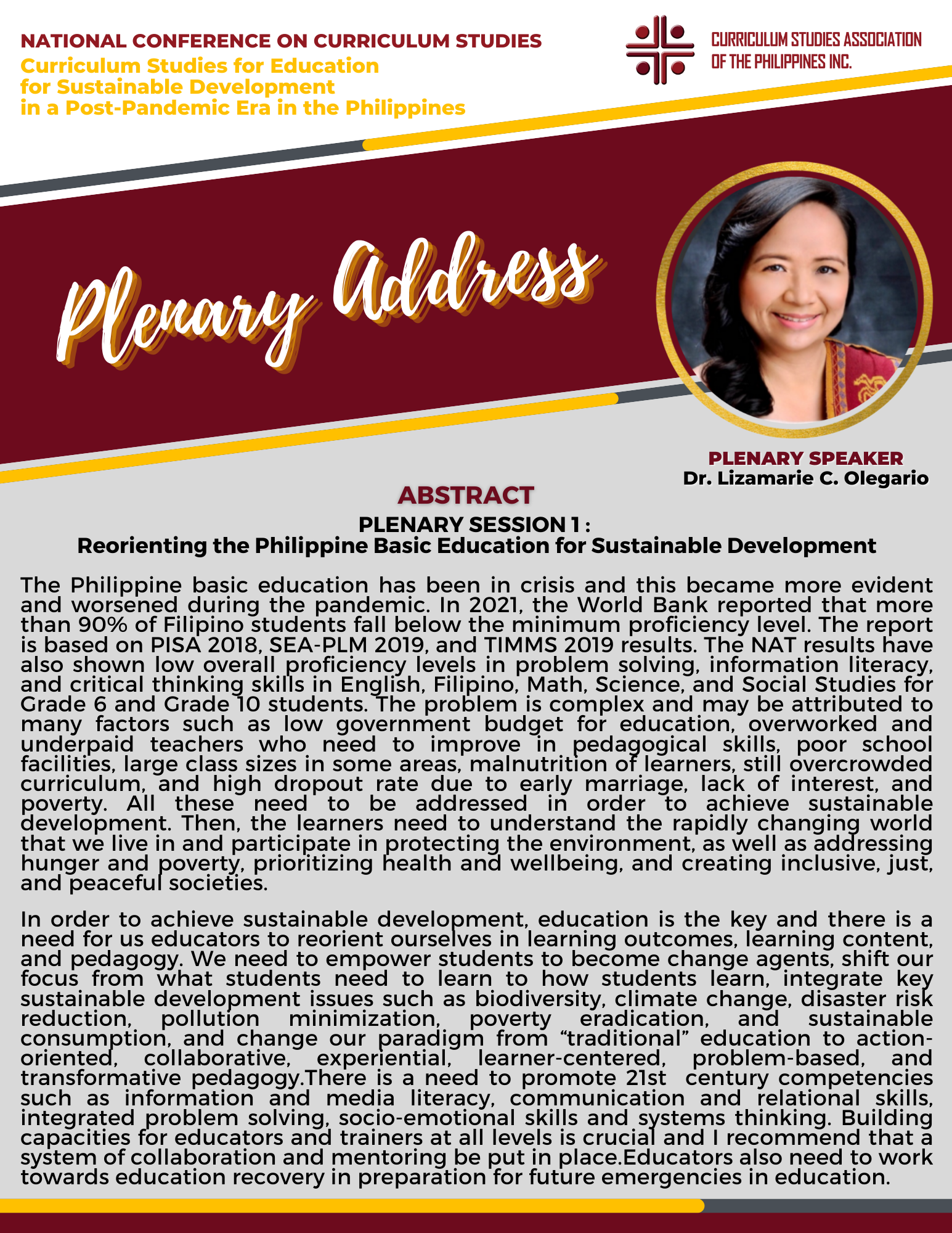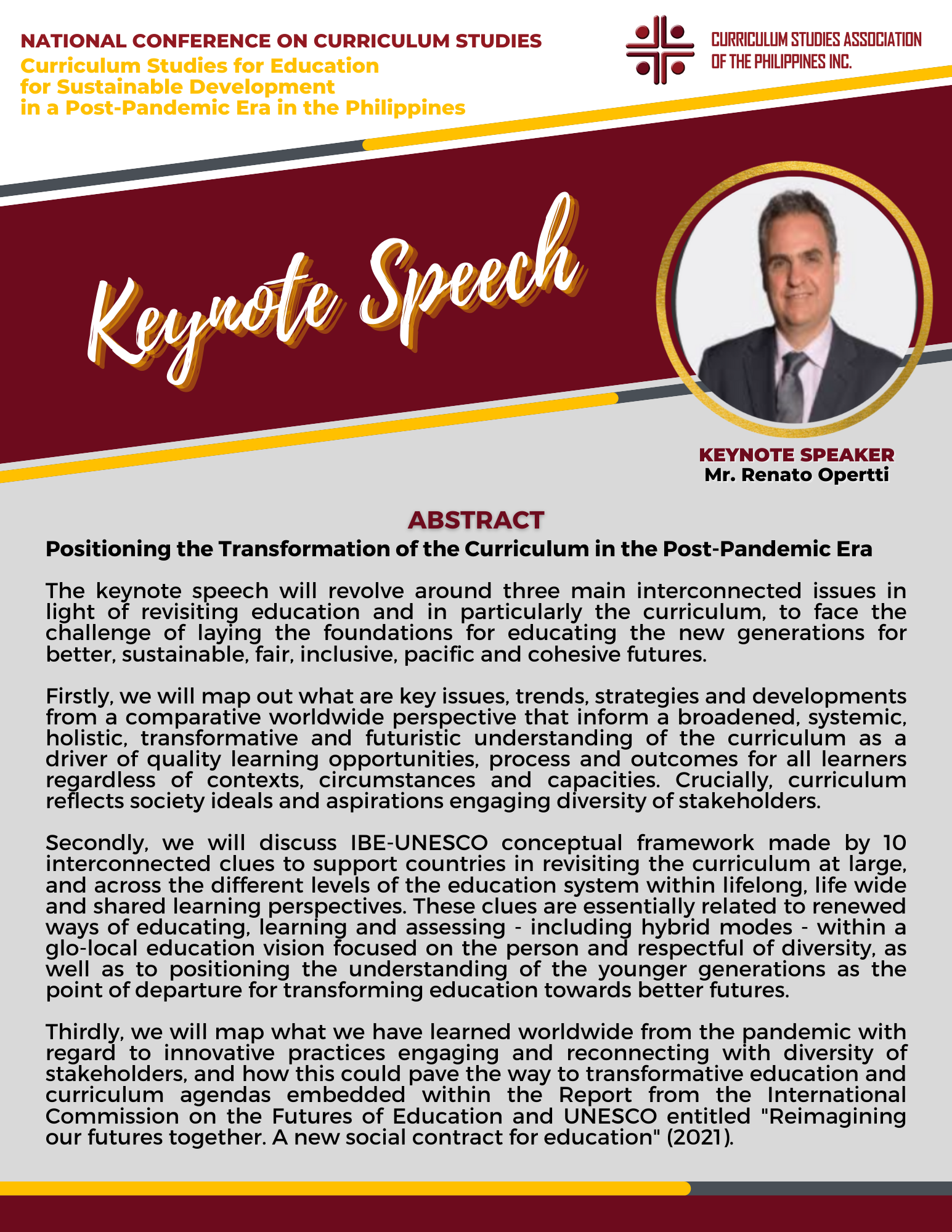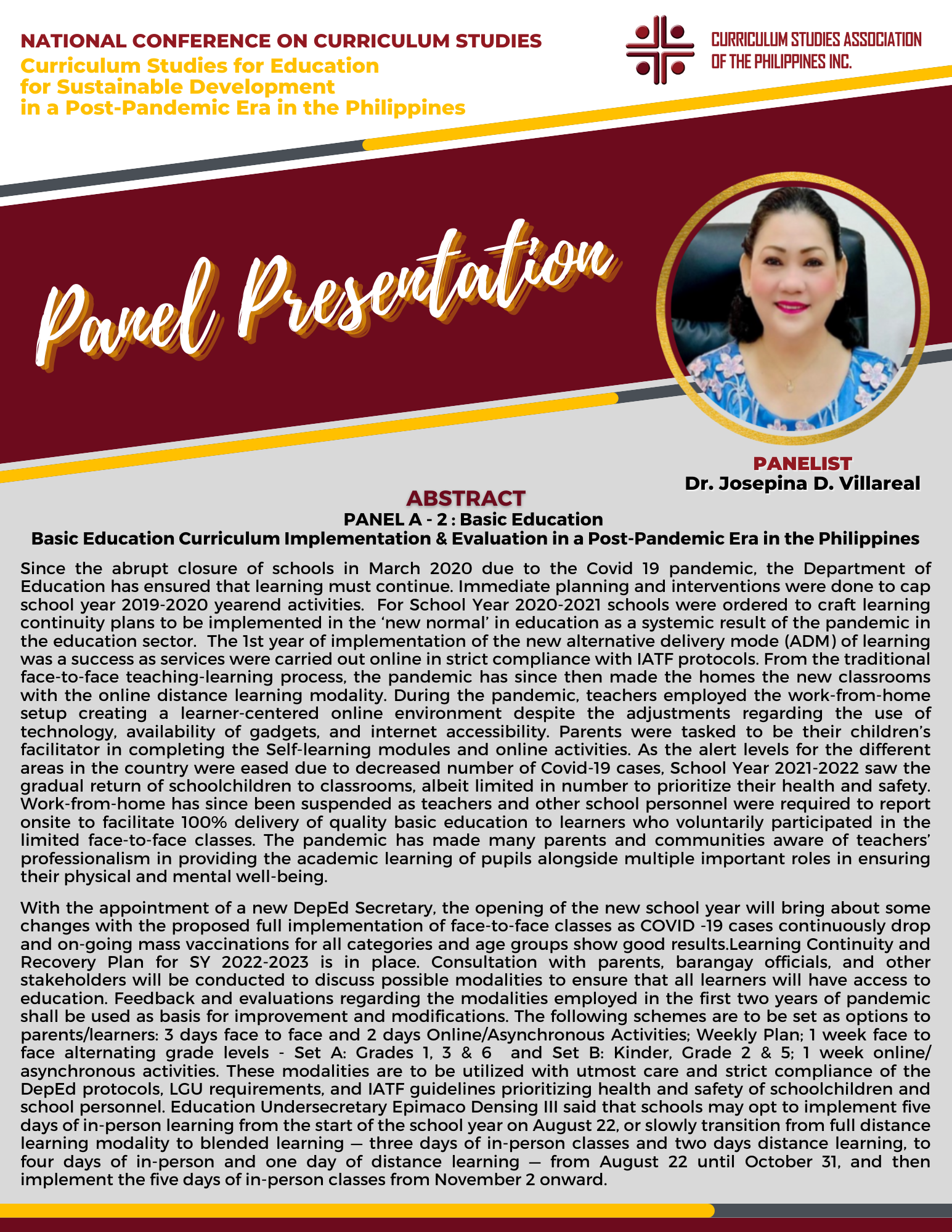 There were two Keynote Speakers, Dr. Ra-shane Meesri from Chulalongkorn University, Thailand and Mr. Renato Opertti, Senior Program Specialist for Innovation and Leadership in Curriculum and Planning of UNESCO-IBE. Both touched on the theme for this year, “Curriculum Studies for Education for Sustainable Development in a Post-Pandemic Era”. Plenary Speakers representing Basic Education, Higher Education and Technical-Vocational Education and Training (TVET) gave presentations on the same theme as applied to their respective educational level of expertise. Panel Discussion followed in the afternoon then capped by simultaneous Parallel Presentations on how the theme on Education for Sustainable Development applied to the following strands : Curriculum planning/designing, Curriculum implementation and evaluation, and Instructional designing.