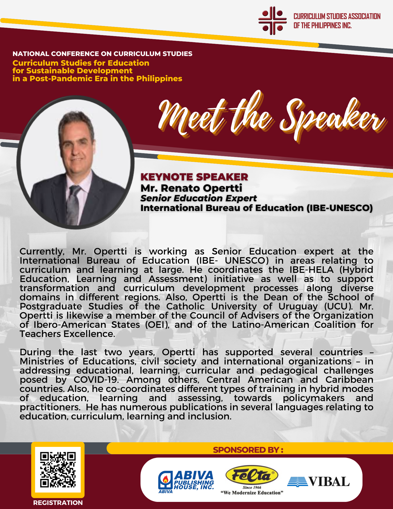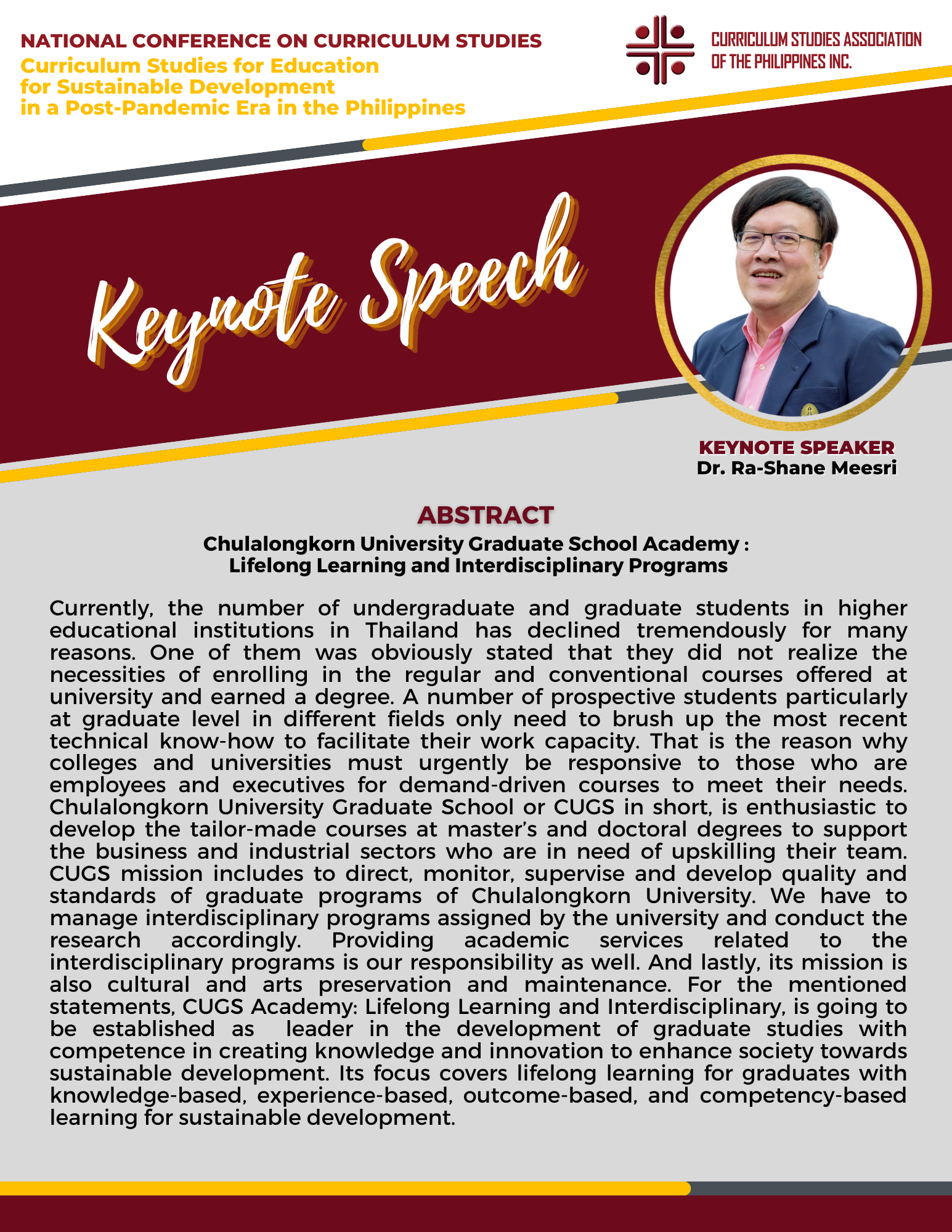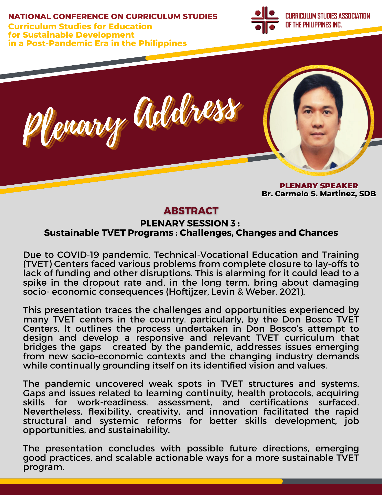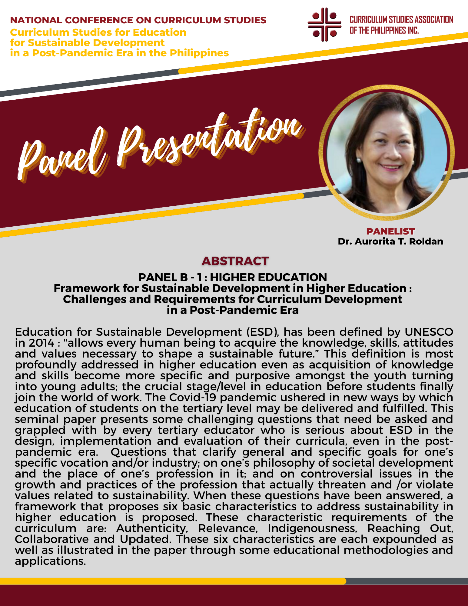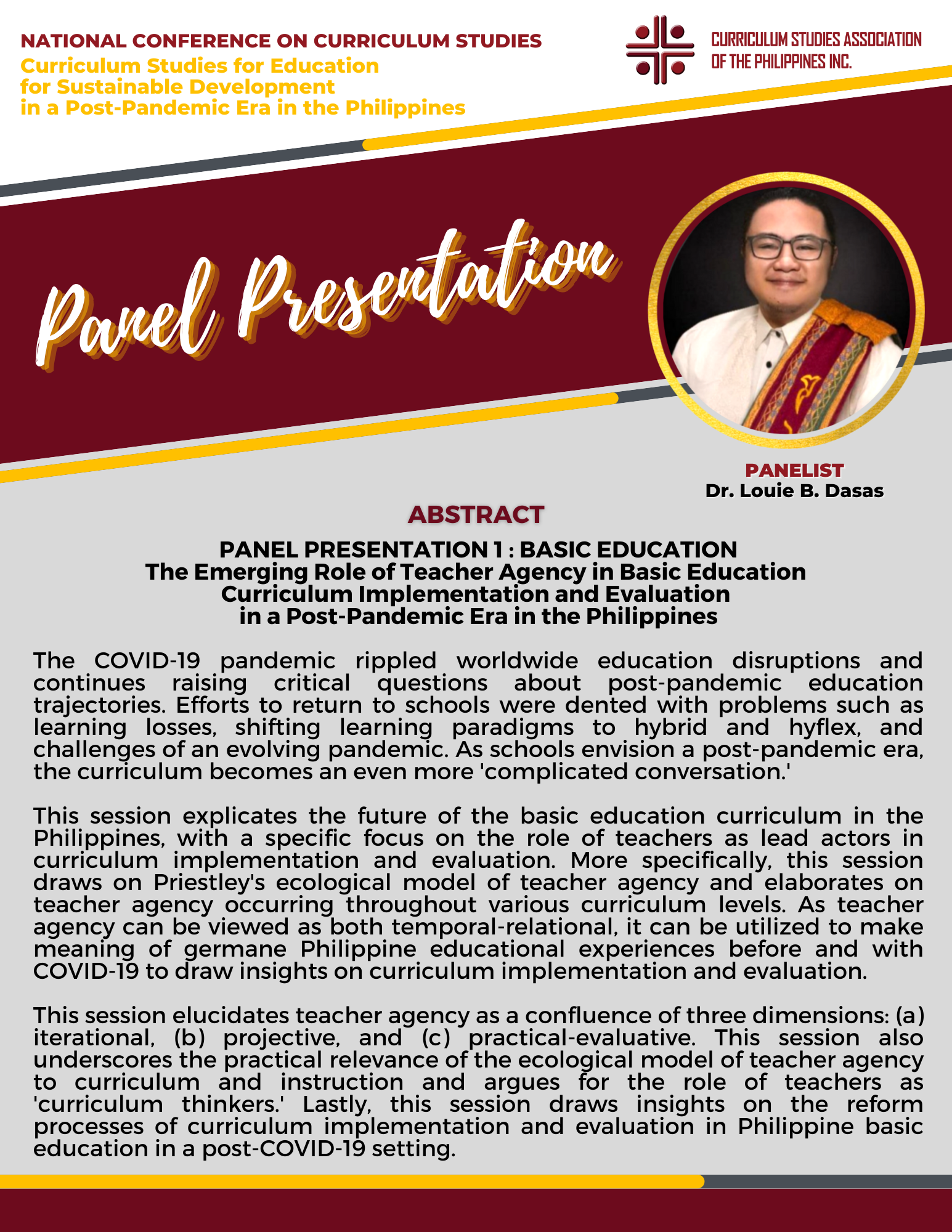 There were two Keynote Speakers, Dr. Ra-shane Meesri from Chulalongkorn University, Thailand and Mr. Renato Opertti, Senior Program Specialist for Innovation and Leadership in Curriculum and Planning of UNESCO-IBE. Both touched on the theme for this year, “Curriculum Studies for Education for Sustainable Development in a Post-Pandemic Era”. Plenary Speakers representing Basic Education, Higher Education and Technical-Vocational Education and Training (TVET) gave presentations on the same theme as applied to their respective educational level of expertise. Panel Discussion followed in the afternoon then capped by simultaneous Parallel Presentations on how the theme on Education for Sustainable Development applied to the following strands : Curriculum planning/designing, Curriculum implementation and evaluation, and Instructional designing.