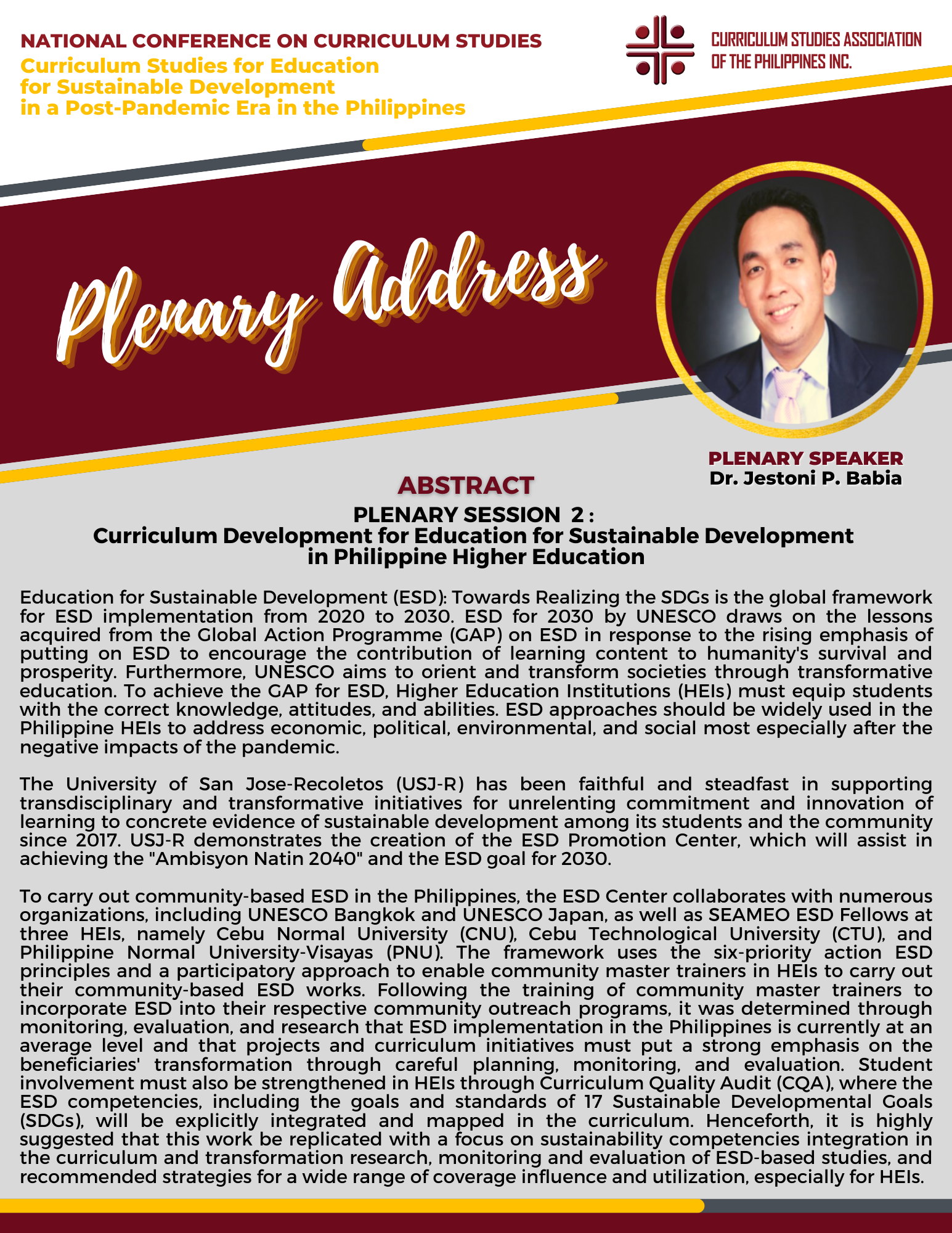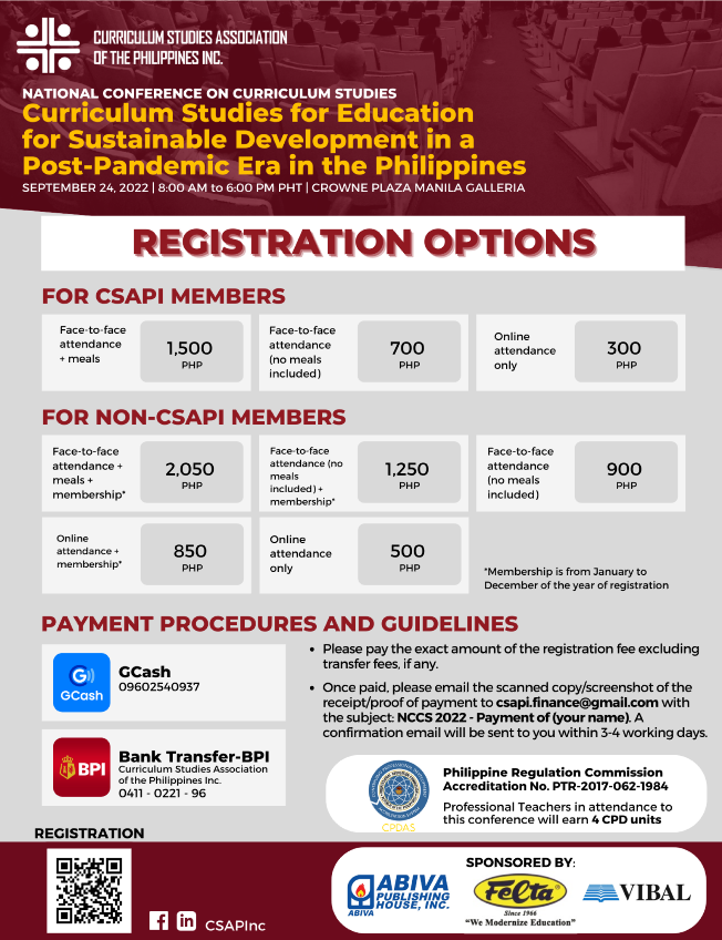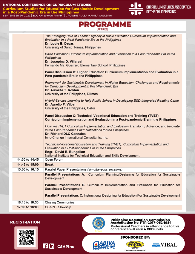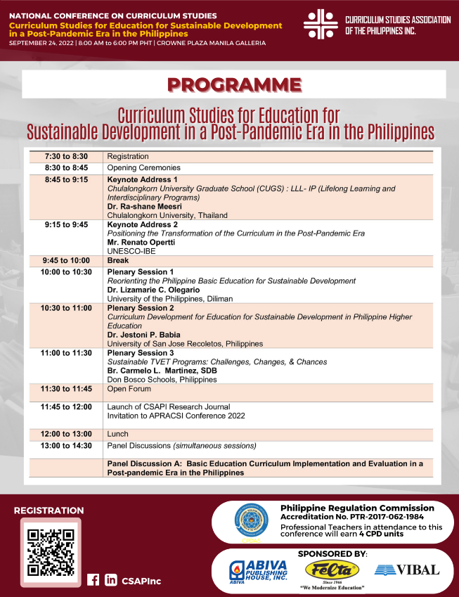 CSAPI held its second annual National Conference on Curriculum Studies (NCCS) with the theme, Curriculum Studies for Education for Sustainable Development in a Post-Pandemic Era in the Philippines. The conference, with more than 250 participants both onsite and online, highlighted the role of curriculum studies in achieving education for sustainable development in the Philippines. The conference was designed to underscore the best practices in curriculum designing, implementation, and evaluation of curricular programs with integrated sustainable development. Based on these practices, curriculum practitioners and educators can be guided in crafting programs relevant, appropriate, and responsive to the new normal.